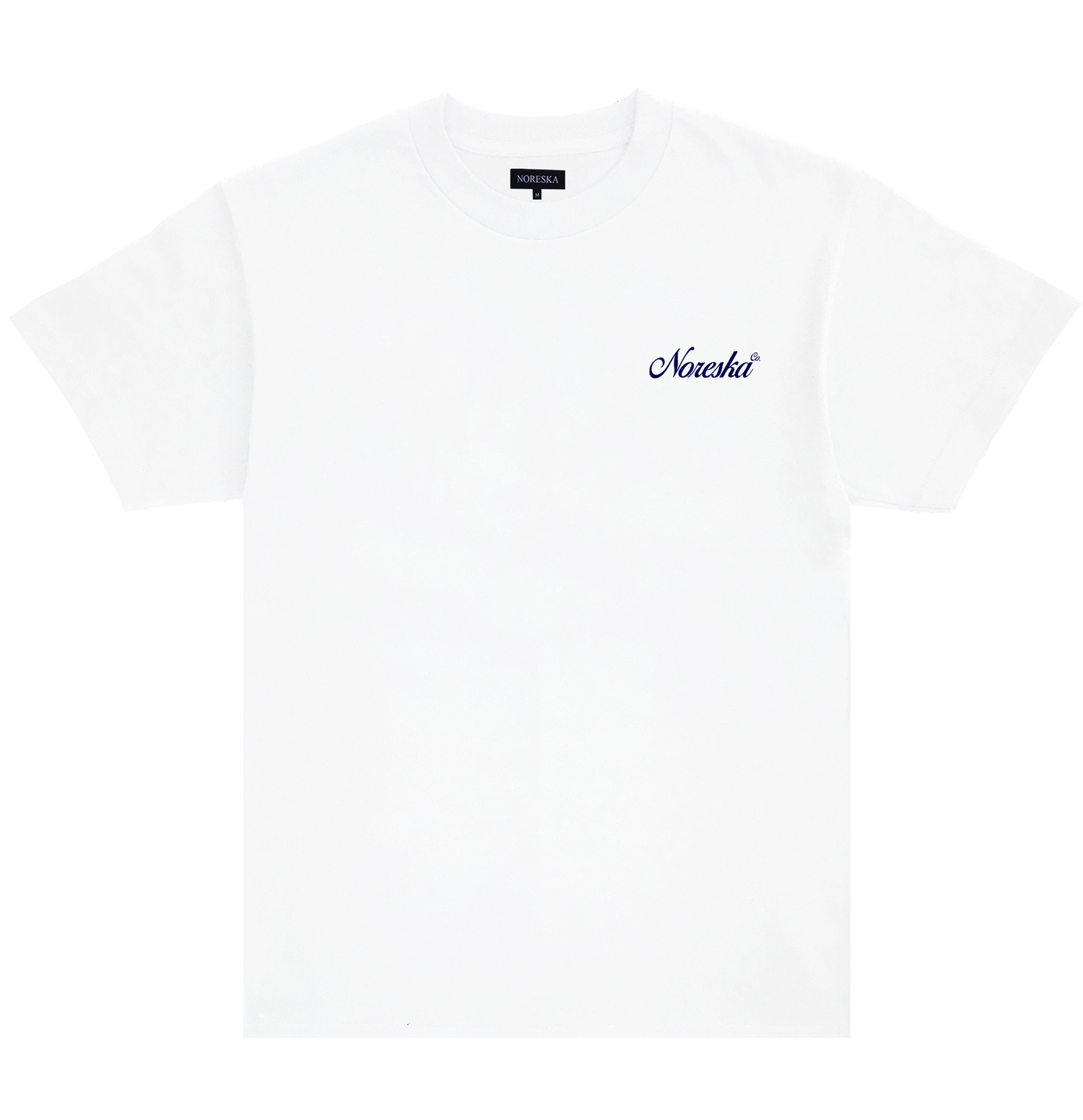 -Camiseta 6 oz. 100% algodón color blanca con serigrafía azul oscuro delante y detrás, cuello ancho sin costuras alrededor.